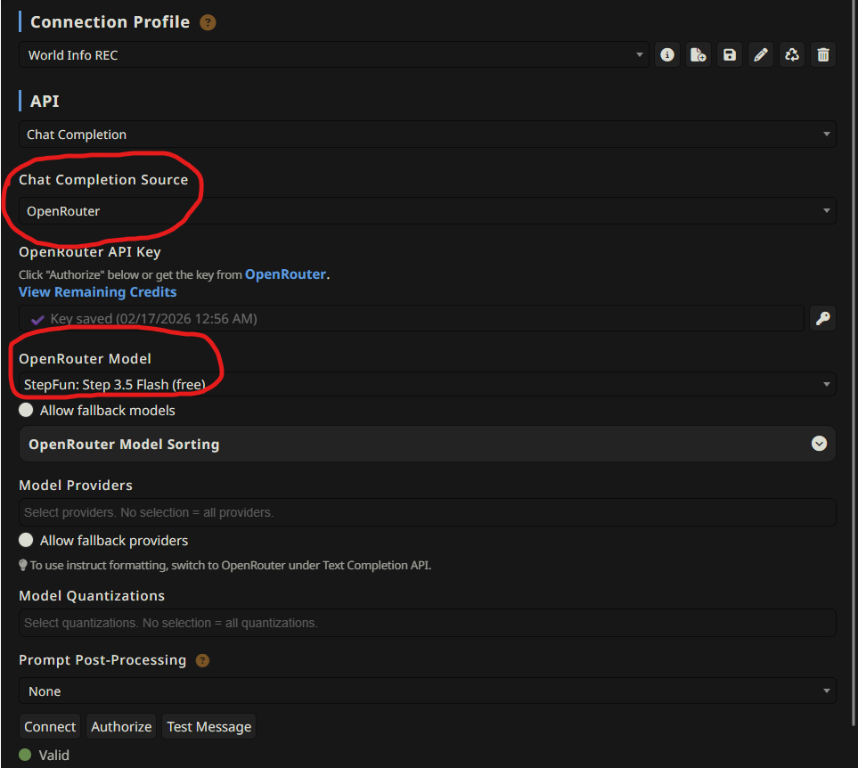 You will find that certain models excel in certain ways. The best way to find out which model is ideal for you is to experiment! Weave different tales utilizing the available free models (or paid) and see how the LLM captures the details presented in your story. The three options I have provided above are fairly accurate, free, quick, (and did I mention free?), so don’t hesitate to try them all out. Once you make a selection, it’s time to make a Configuration Profile. For the sake of the guide, I’ll be using StepFun 3.5 Flash.