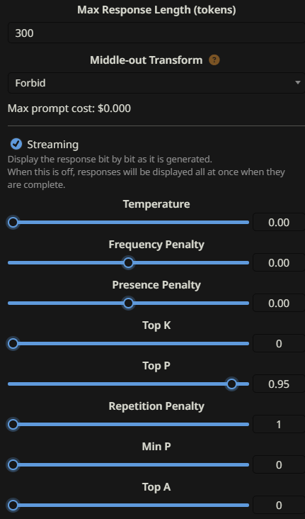 Ideally, you do NOT want to use your default connection/completion preset for Qvink. It’s usually overkill for the simple task of summarizing. You want to use an LLM that is quick, efficient, and good at following instructions (Gemini 2.0/2.5 Flash come to mind). Reasoning is time-consuming and not needed. Personally, I use free LLMs available on OpenRouter. At the time of this article, I have used: